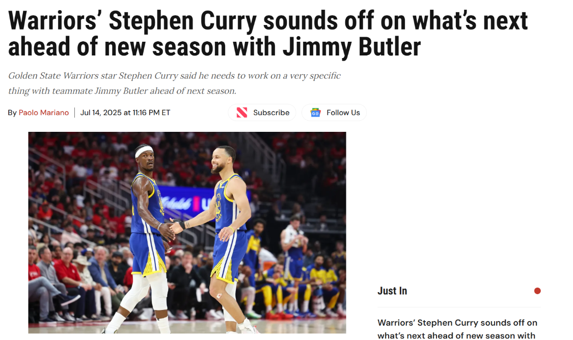 除此之外,库里也谈到了巴特勒加入到球队:“我知道我受伤了。但你只是想在这基础上再花一年时间和吉米建立化学反应。你知道德拉蒙德会做他的事情。希望我们的一些年轻人能够再迈出一步。这是每年的过程。只要把我们做得很好,知道我们必须提升它,并在一整年里更加稳定地做到这一点。”