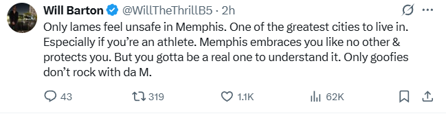 今日,前掘金球员威尔·巴顿更新社媒谈及在孟菲斯打球的安全问题,他表示:“只有懦夫才会在孟菲斯感到不安全,这是最适合居住的伟大城市之一,尤其对运动员而言。孟菲斯会以无与伦比的方式接纳你、保护你。但只有真正懂行的人才能理解这一点,不与孟菲斯为伍的都是蠢货。”